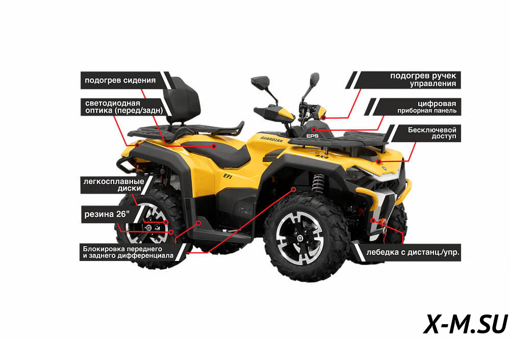 Представляем новый квадроцикл HiSUN GUARDIAN 750 S! Его девиз – надежность, проходимость, комфорт и маневренность. Он оснащен всем необходимым для вашего удобства: светодиодная оптика, передний и задний багажники, металлические бампера, защита рук и зеркала заднего вида. Одним из ключевых преимуществ техники HiSUN является мощный четырехтактный двигатель, который позволяет занимать лидирующие позиции в своем классе. Для вашего комфорта также предусмотрен обогрев ручек управления и сидений квадроцикла. Блокировка переднего и заднего дифференциала делают его еще более маневренным.
